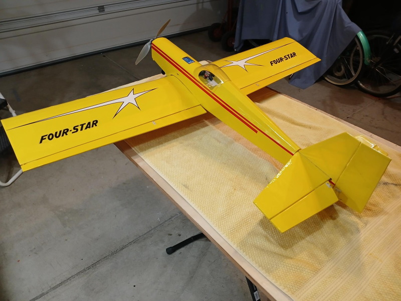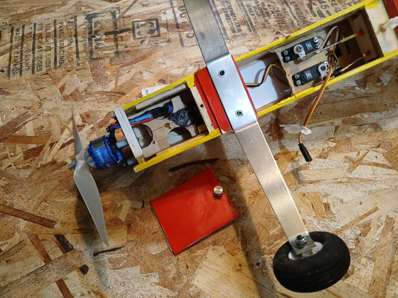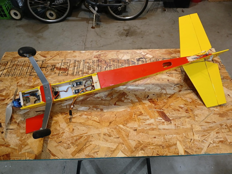 Has a removable battery hatch cover, flys nice on a 3S 1500 mAh lipo battery. Could use a tail wheel.